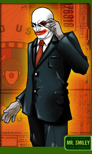 Mr. Smiley is a shadow figure, an enigma. While his face is tinted white like a Clown Commando, he is always seen wearing civilian clothing--a plain black suit. Although he does not officially command the unit, he seems to act as a liaison between the Commandos and any outside organizations. It is believed by some that Mr. Smiley was a founding member of Patton's Pranksters, the first unit of Clown Commandos to see action, but his service record is sealed, and no one can know anything about him for certain. The relationship between Mr. Smiley and Colonel Clown is uncertain, though the Colonel does seem to hold a grudging respect for the mysterious Clown in black.