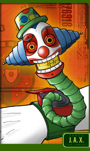 JAX was originally created as a communications program. He acquired self-awareness, and is now an Artificial Intelligence residing in the special wrist communicators that are standard Clown Commando gear. He helps the Commandos communicate with one another, is a keeper of endless data, and can hack any system anywhere if ordered to do so. Since JAX is an A.I. that resides simultaneously in all communicators, he always knows the condition and location of every Clown Commando. He is also developing a rather brash personality.